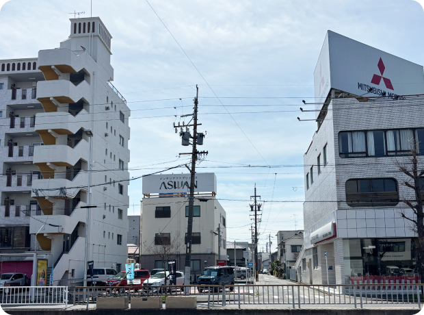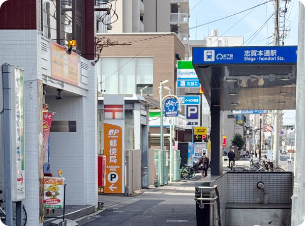 志賀本通駅1番出口を出て、地上に出たら東方向(大曽根方面)へ進みます。